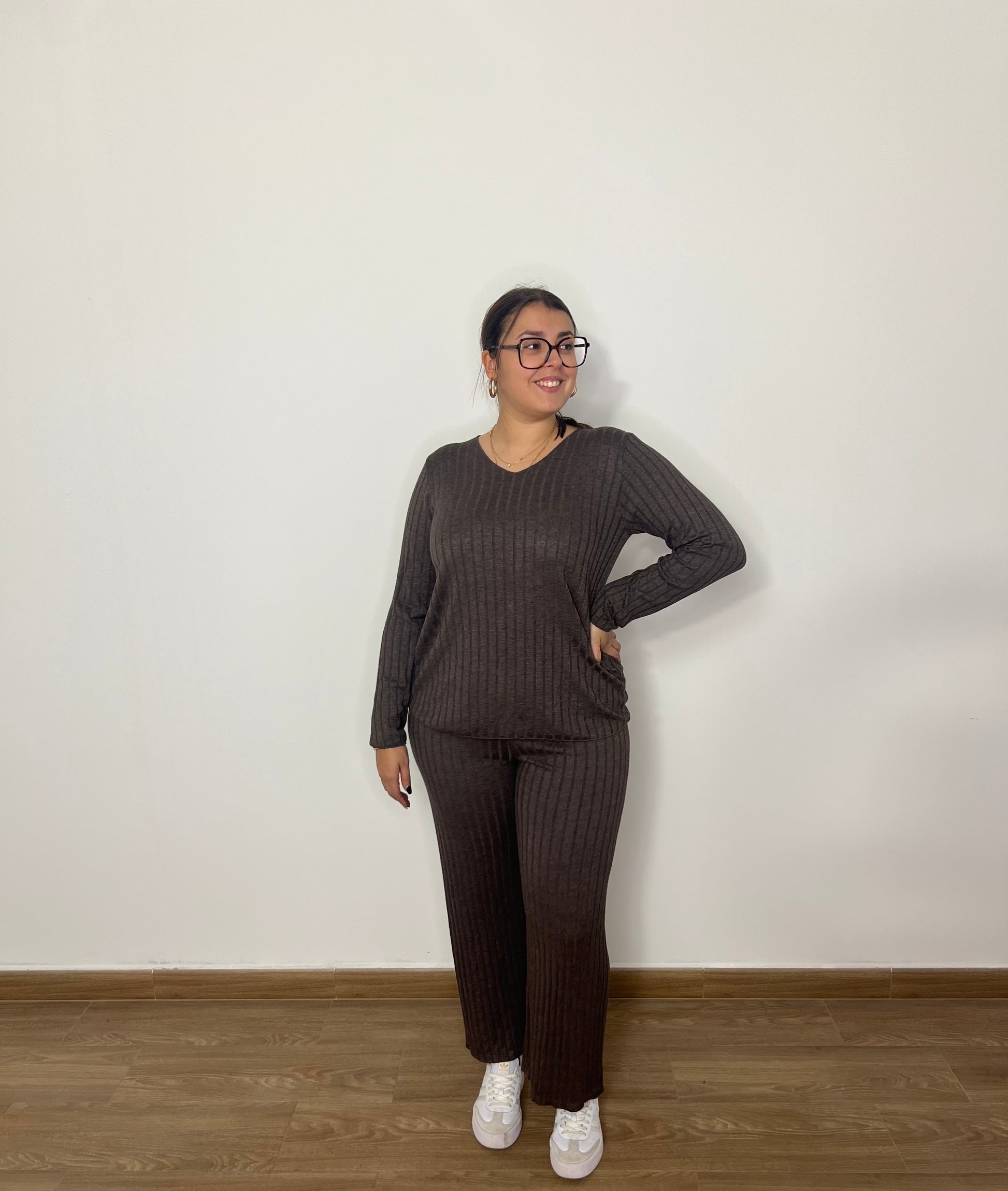 Cómodo, ligero y muy versátil. Este conjunto fino en color marrón destaca por su tejido suave y agradable, ideal para el día a día. La parte superior presenta un cuello redondo que aporta un toque clásico y favorecedor, mientras que el diseño completo ofrece libertad de movimiento y una sensación de confort total. Una opción perfecta para looks relajados, frescos y con estilo.